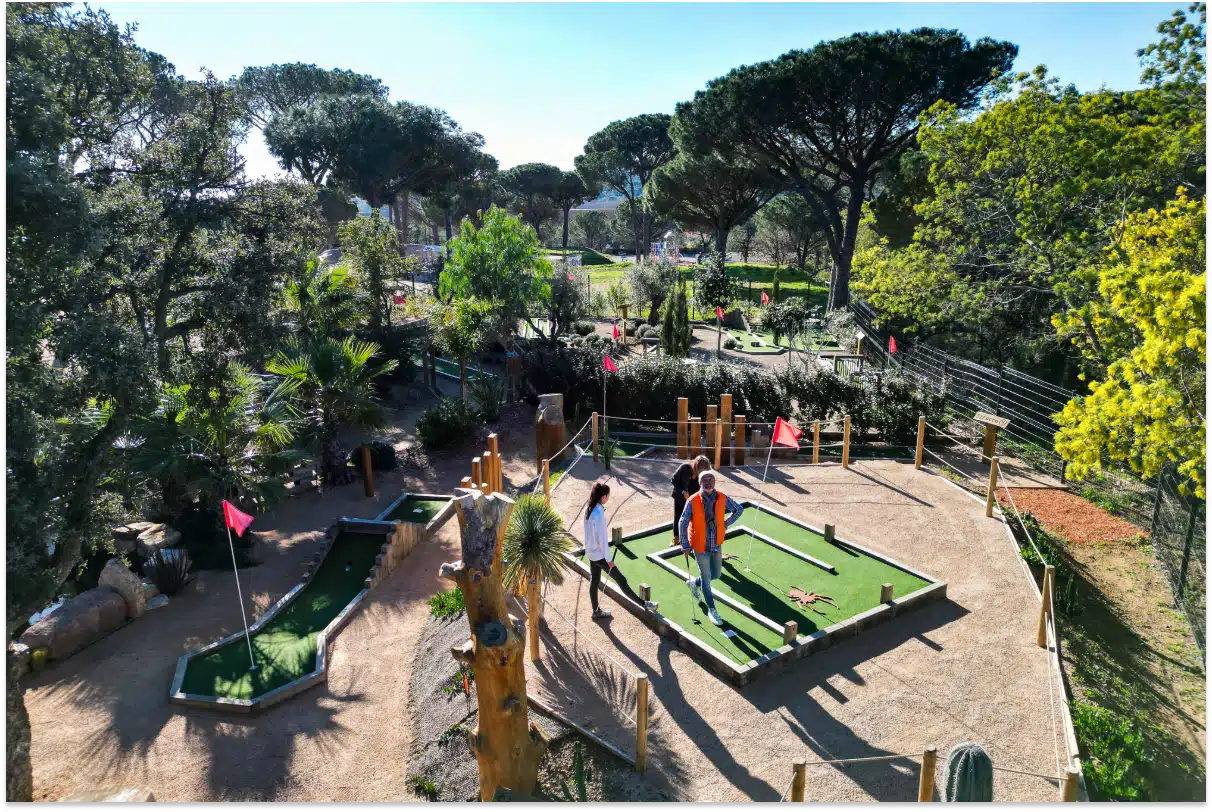 It is carried by the winds that our three courses were born. In an intimate and green setting on the edge of a pine forest and a tree park, we have imagined for your greatest pleasure, 21 holes of mini-golf, spread over 3 courses. In the shade of some mulberry trees, you will discover the 3 arches that will give you access to the 3 courses.
