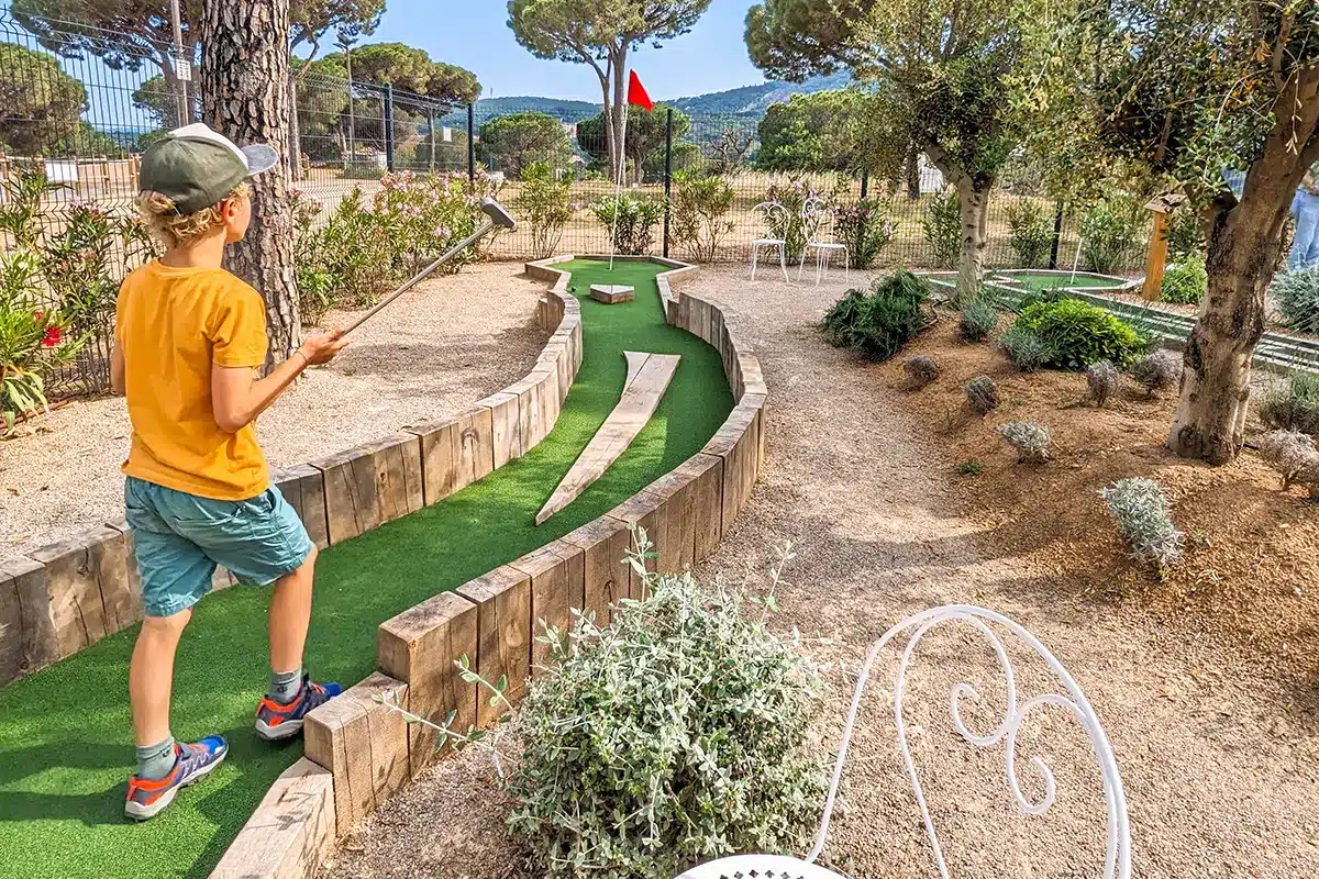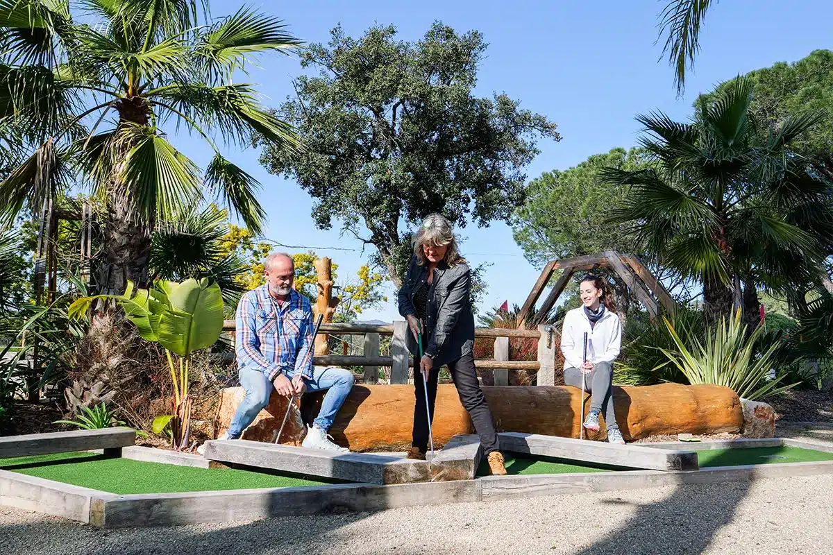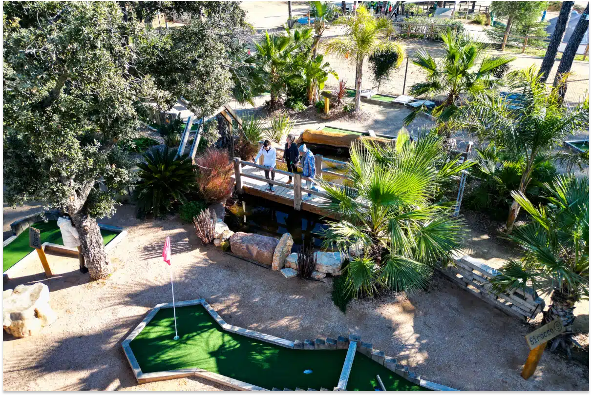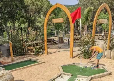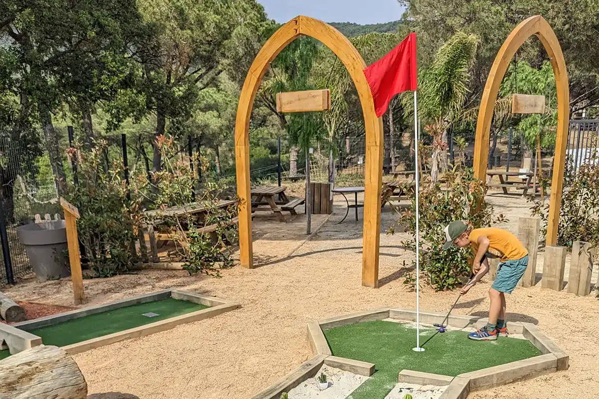 It is carried by the winds that our three courses were born. In an intimate and green setting on the edge of a pine forest and a tree park, we have imagined 21 holes of mini-golf, spread over 3 courses, for your greatest pleasure. When you arrive, take your time and receive the vibrations and energies of our “garden”. In the shade of some mulberry trees, you will discover the 3 arches that will give you access to the 3 courses. As you wish, we invite you to pass an arch and discover our mini-golf course.
