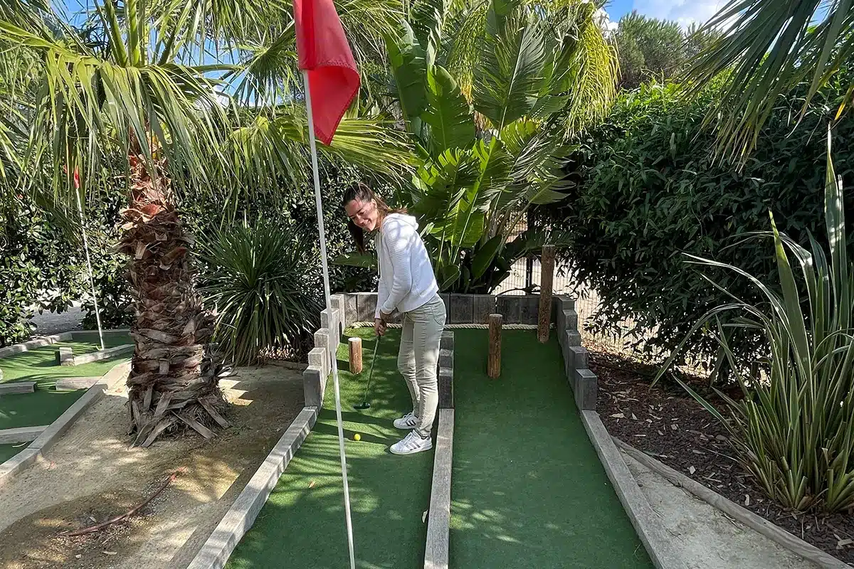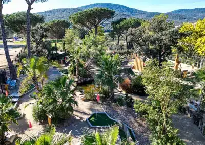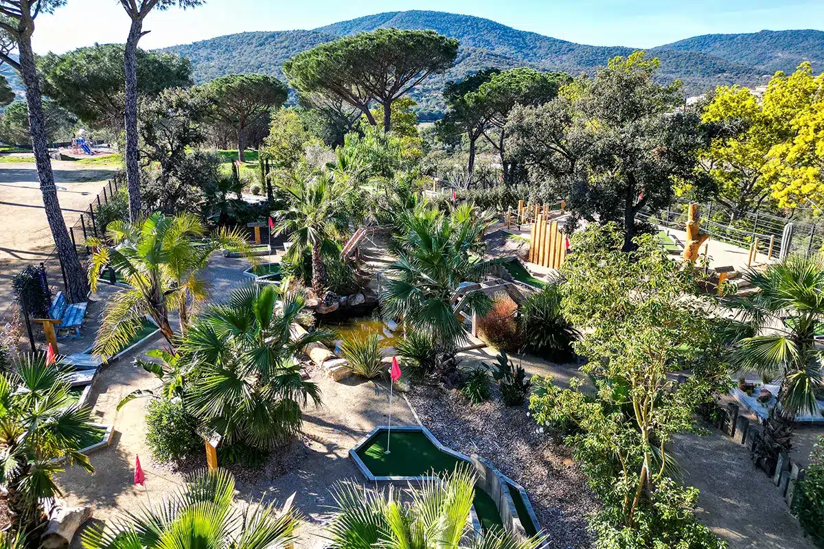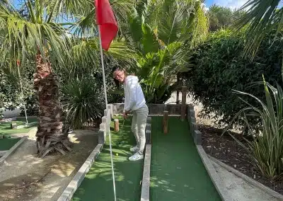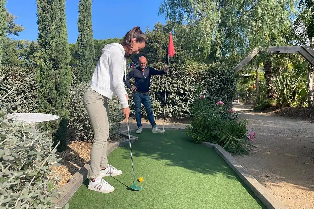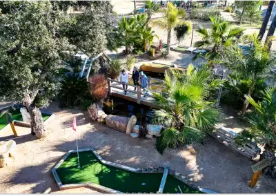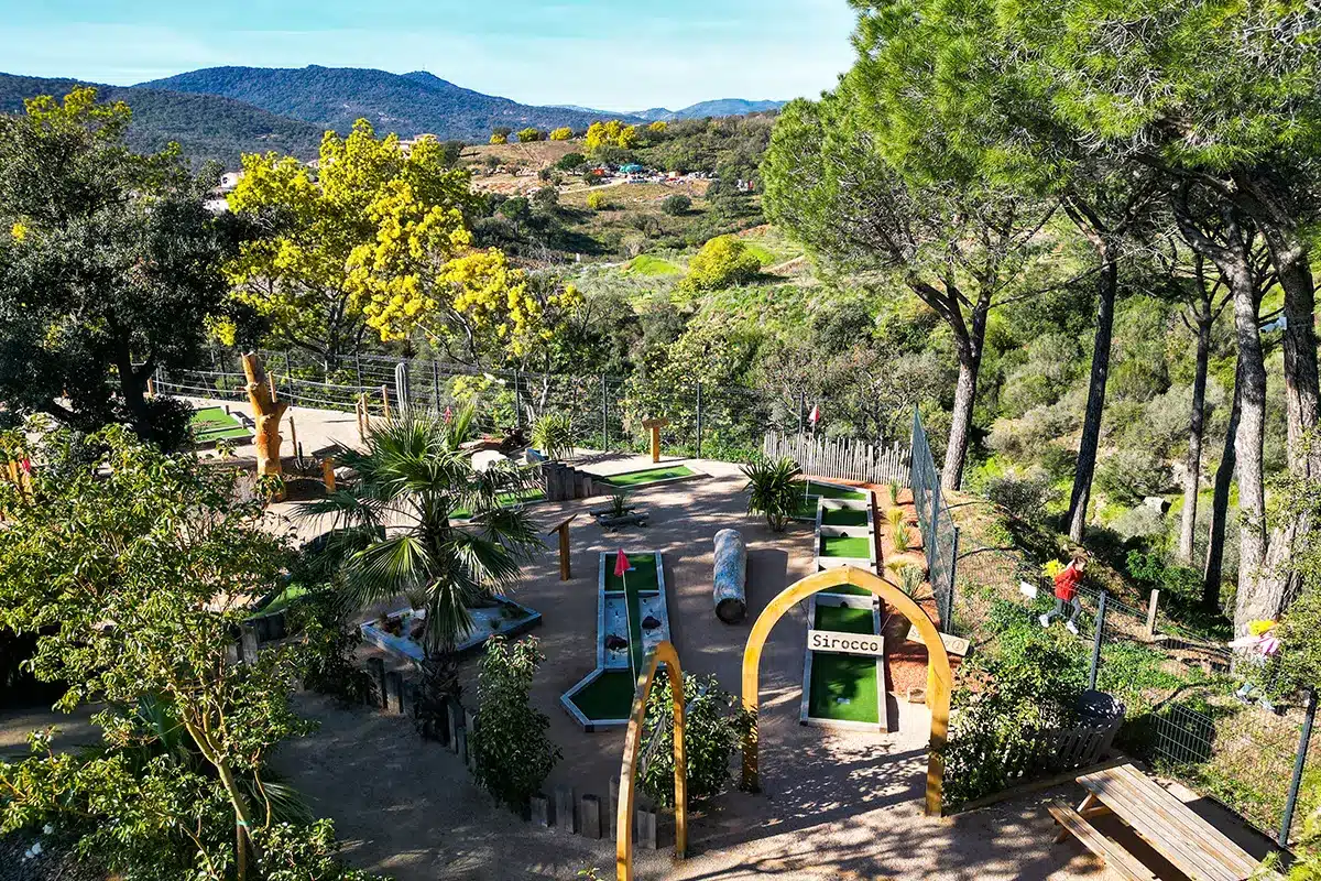 It is carried by the winds that our three courses were born. In an intimate and green setting on the edge of a pine forest and a tree park, we have imagined 21 holes of mini-golf, spread over 3 courses, for your greatest pleasure. When you arrive, take your time and receive the vibrations and energies of our “garden”. In the shade of some mulberry trees, you will discover the 3 arches that will give you access to the 3 courses. As you wish, we invite you to pass an arch and discover our mini-golf course.
